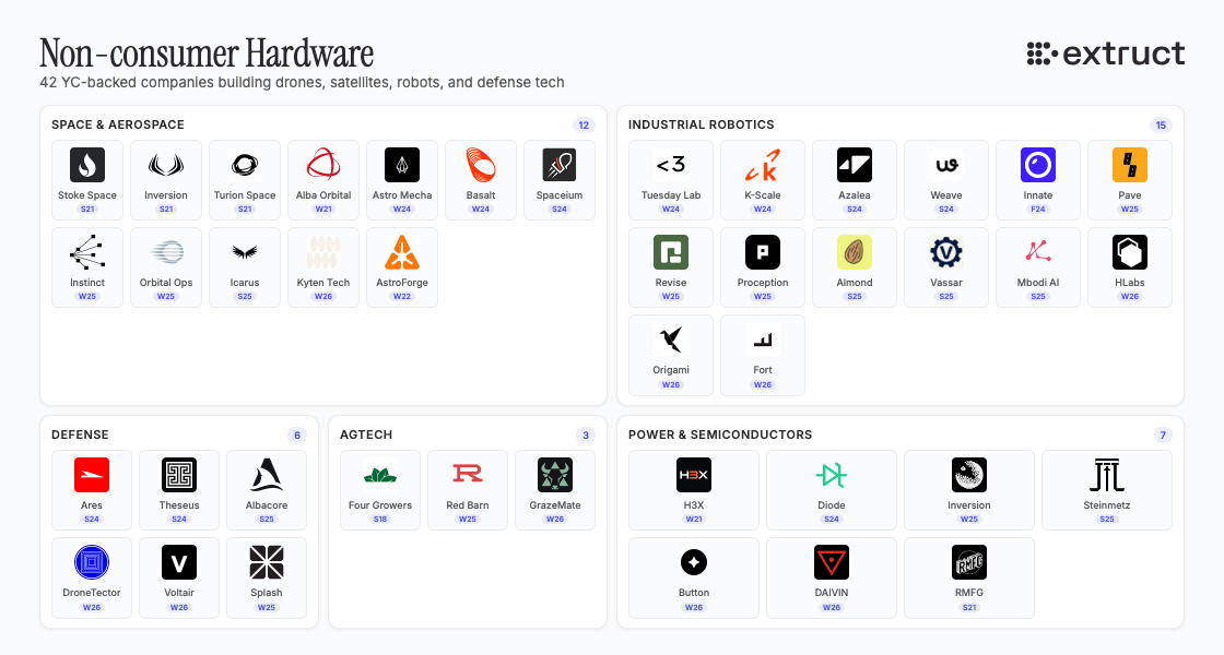 In February 2024, YC published its first RFS update since 2018, listing 20 categories it wants to fund. Seven directly target the physical world: robotics, physical world simulation, defense tech, manufacturing reshoring, space, Modern Metal Mills (software-defined systems to rebuild mills).