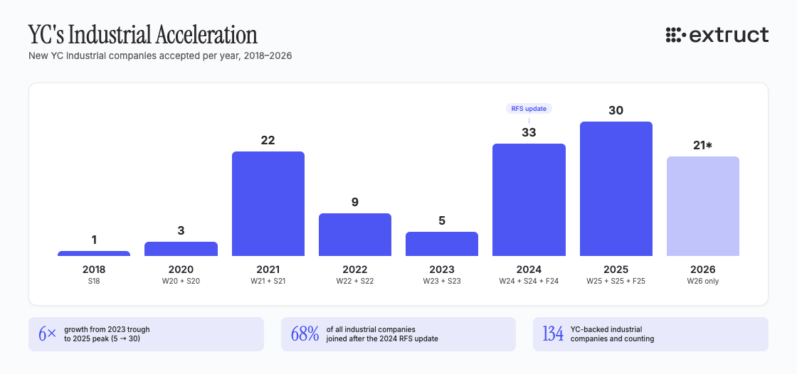 The numbers tell the story: YC accepted 18 industrial companies in 2021, then just 3 in all of 2023. After the February 2024 RFS update explicitly calling for factory founders, the floodgates opened, 21 in 2024, 24 in 2025, and W26 is already at 6, with the batch barely started.